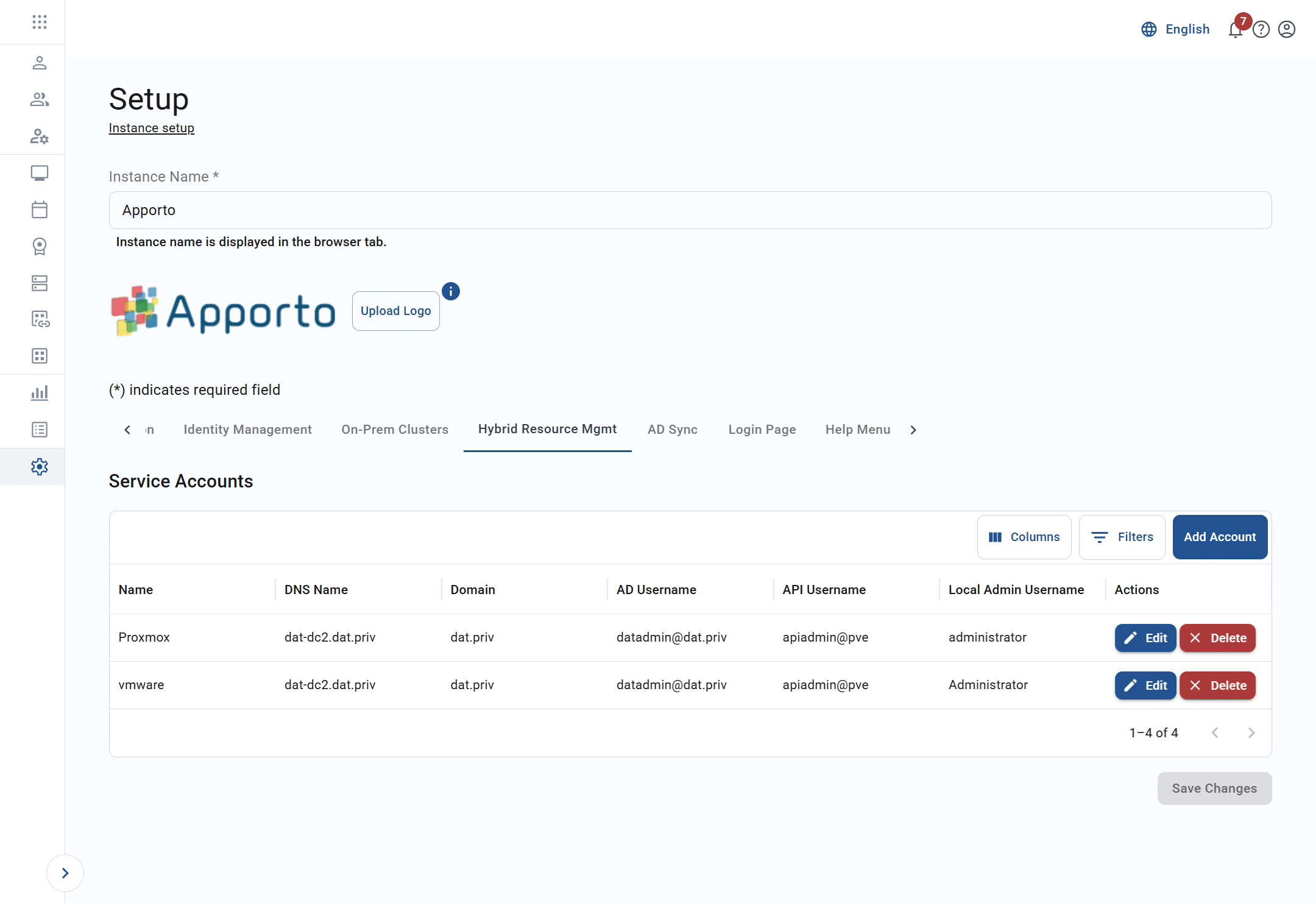 The “Hybrid Resource Management” tab on the Setup page shows a list of all the service accounts for your Apporto instance. To access this page, follow the steps below.