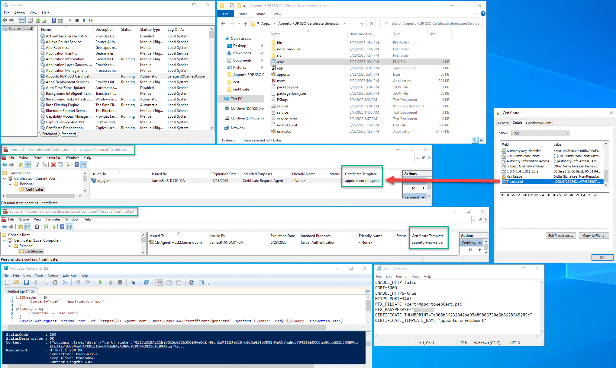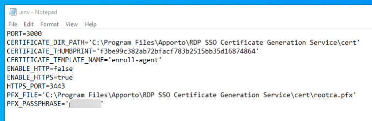 - Open C:Program FilesApportoRDP SSO Certificate Generation Service.env and replace the following: