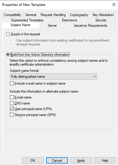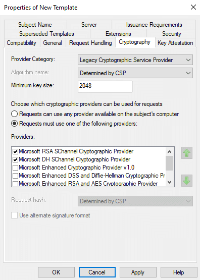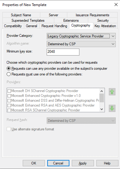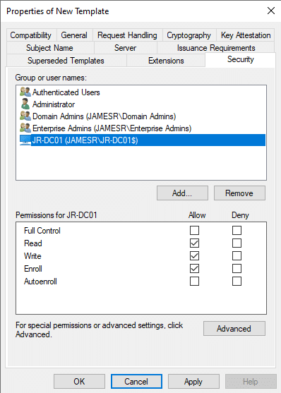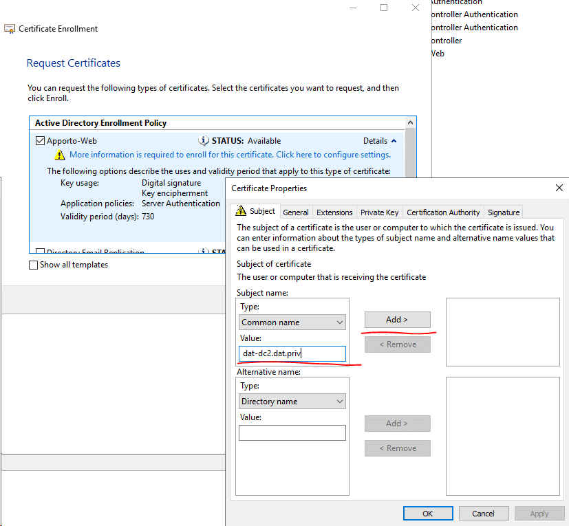 Note: If you have few root CA in your domain (you can check it by opening pkiview.msc – Manage AD Containers), you should check which CA you are going to use. When you are requesting a certificate, open the details of your certificate template and click on Properties, then go to the Certification Authority tab where you can select the necessary CA.
