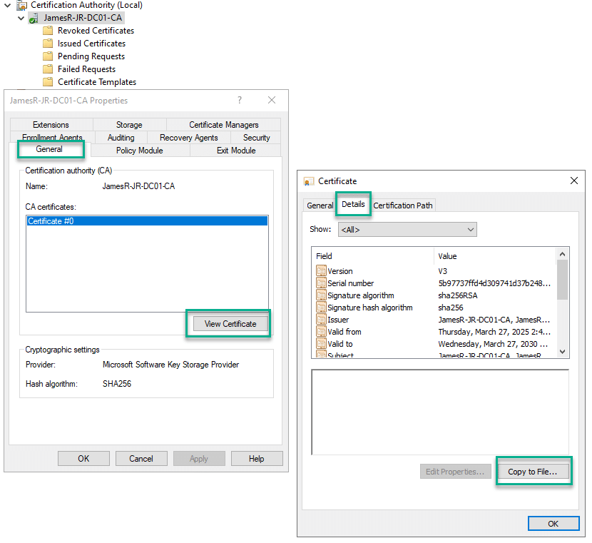- In Properties, open the General tab and go to Certificate #0 (this is your root CA) – View Certificate.