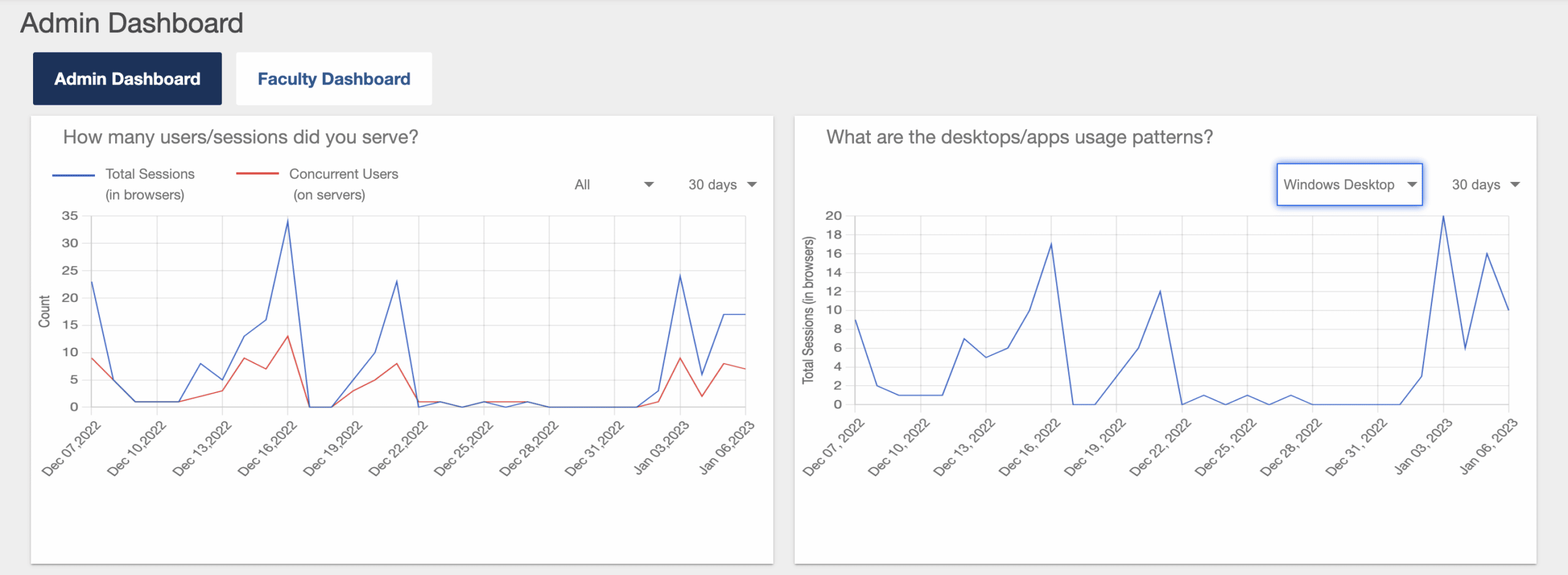 The Admin Dashboard provides administrators with high-level usage statistics, including the total number of sessions served, concurrent users, which apps are used the most, and where users login from.