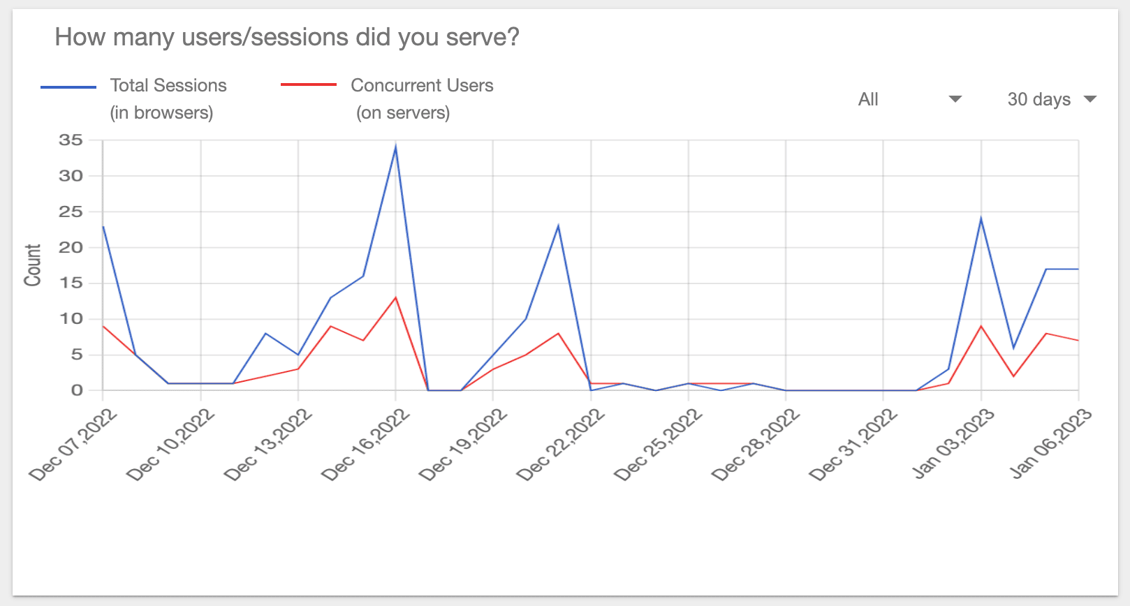 If more granular data is required, you may export sessions data from the Sessions screen. Exported data is downloaded to a CSV file which you may then import into Excel, Tableau, or another tool for further analysis.